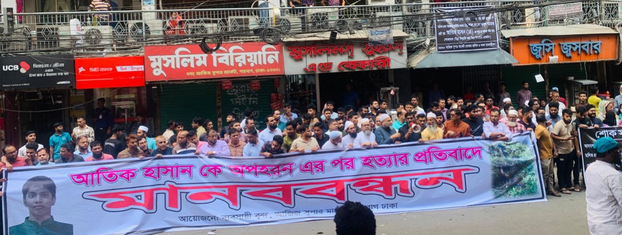 আতিক হাসানকে অপহরণের পর নির্মমভাবে হত্যার প্রতিবাদে শাহবাগে মানববন্ধন ও বিক্ষোভ সমাবেশ করেছে আজিজ সুপার মার্কেটের দোকান মালিক, কর্মচারী ও স্থানীয়রা।