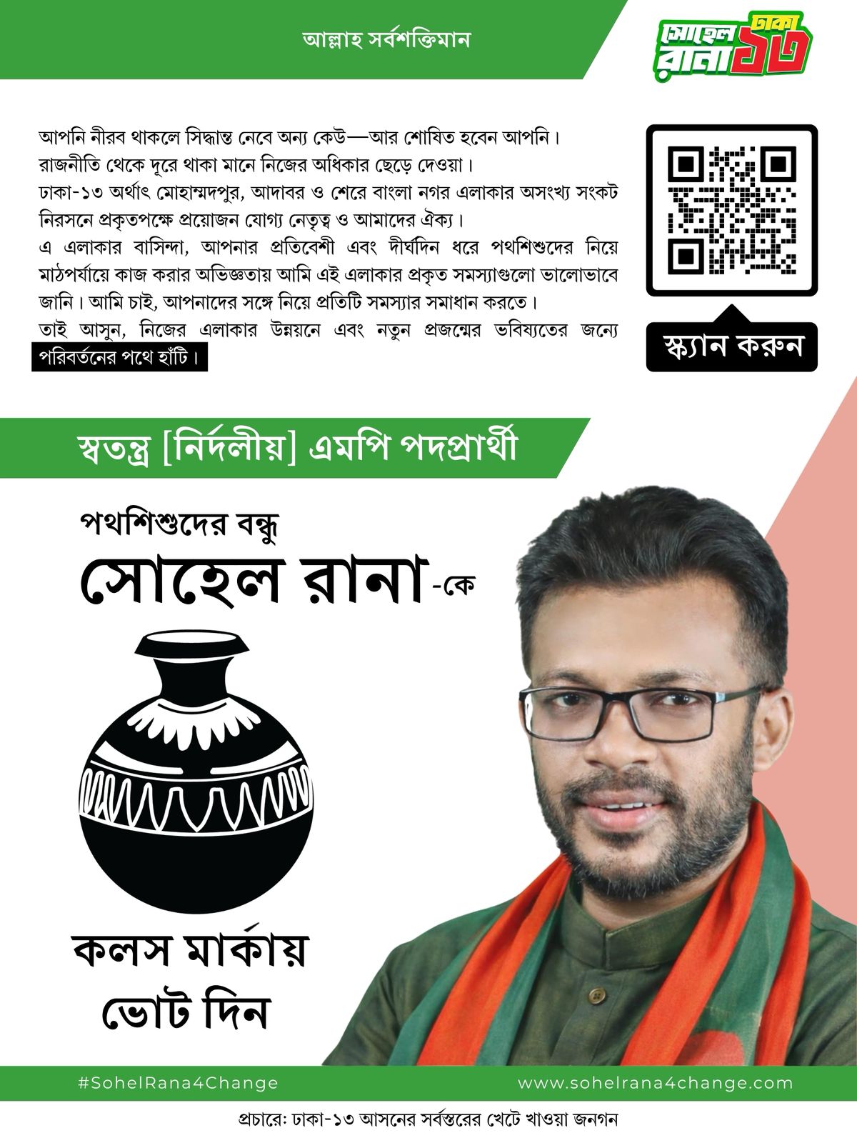ঢাকা ১৩ আসনে পথশিশুদের নিয়ে কাজ করা সোহেল রানা স্বতন্ত্র প্রার্থী ভোটারদের যে আহব্বান জানিয়েছেন