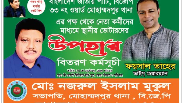 মোহাম্মদপুর থানা ৩৩ নং ওয়ার্ডের ভোটারদের উপহার সামগ্রিক বিতরণ কর্মসূচির ঘোষনা মোহাম্মদপুর থানা বিজেপির সভাপতি নজরুল ইসলাম মুকুল এর নূর হোসাইন: মোহাম্মদপুর থানা ৩৩ নং ওয়ার্ডের ভোটারদের উপহার সামগ্রিক